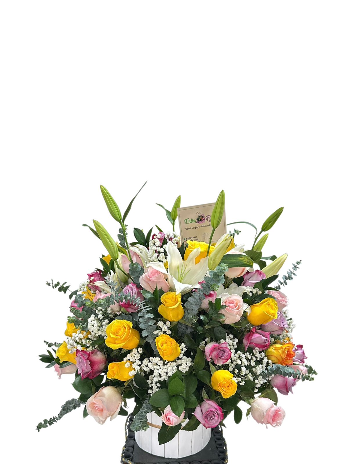 Este elegante ramo floral en Cali ha sido diseñado para transmitir alegría, afecto y buen gusto en cualquier ocasión especial. Elaborado con una cuidadosa selección de rosas frescas en tonos amarillo, rosado y blanco, acompañadas de lirios, gypsophila y follajes naturales, es una opción perfecta para cumpleaños, aniversarios, agradecimientos y regalos corporativos.