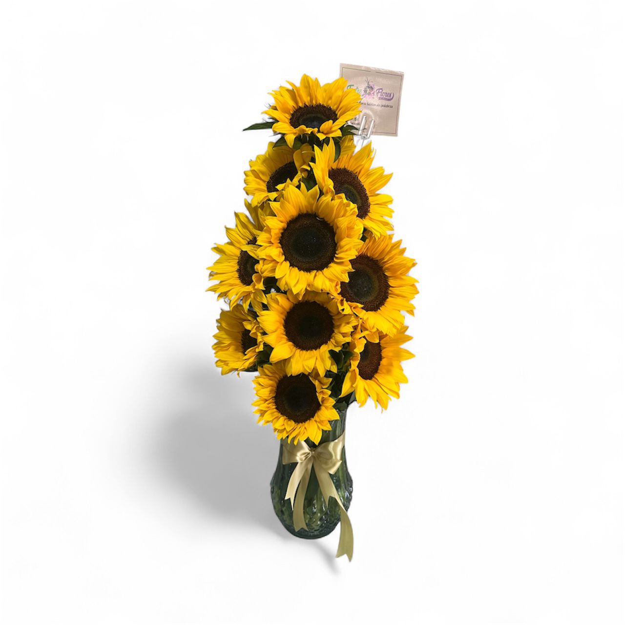 Hermoso ramo de girasoles en cristal, ideal para iluminar cualquier ocasión especial. Perfecto para regalar en cumpleaños, aniversarios o simplemente para sorprender con un detalle lleno de alegría y elegancia. En Entre Flores Cali ofrecemos arreglos florales exclusivos con entrega a domicilio en Cali, Palmira, Jamundí y Yumbo. Nuestros girasoles frescos se acompañan de diseños modernos y elegantes en cristal, pensados para transmitir emociones únicas. Haz tu pedido en línea con diferentes medios de pago y atención personalizada. Sorprende con flores frescas, exclusivas y entregadas con amor. Arreglos florales